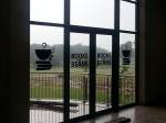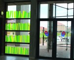 - Detail of glass door with small text.